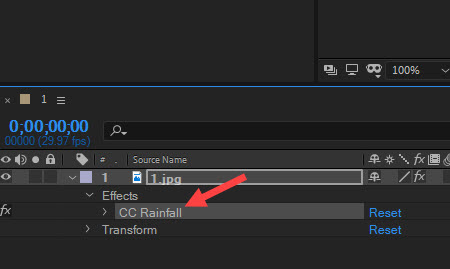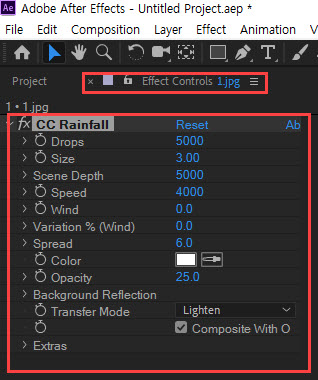 5) You can set the properties of CC Rainfall in the effects added to the layer or in the effect controls panel.