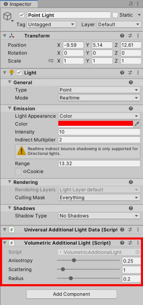 10) Add a Volumetric Additional Light component to the Spot, Point light object and set its properties (anisotropy, scattering, radius)